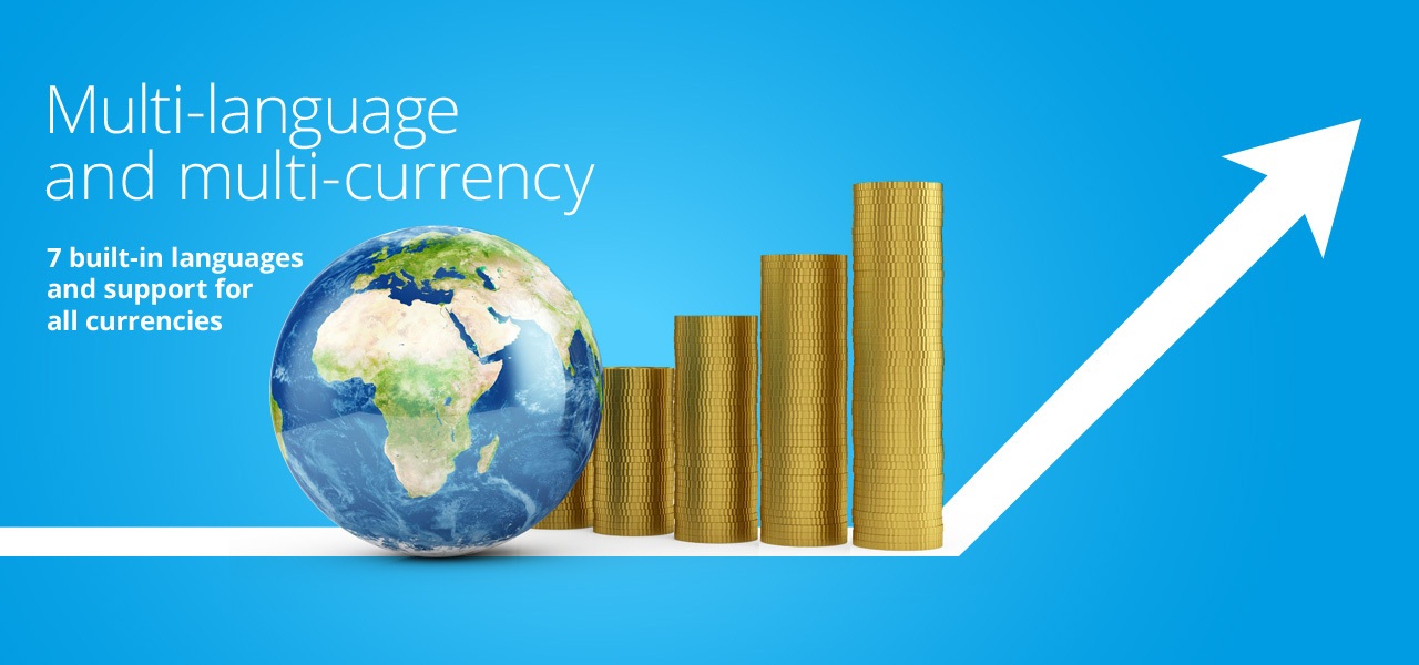 Multi-língua e multi-moeda. 7 línguas em simultâneo e suporte para todas as moedas.